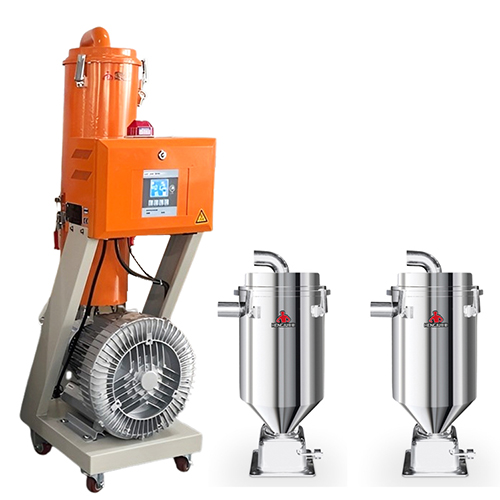 A vacuum loader is a compact, automated device that transports plastic pellets or regrind material from storage containers (such as bags or drums) to the hopper of processing machines. It’s commonly used in small to medium-sized setups where a full central feeding system may not be justified.