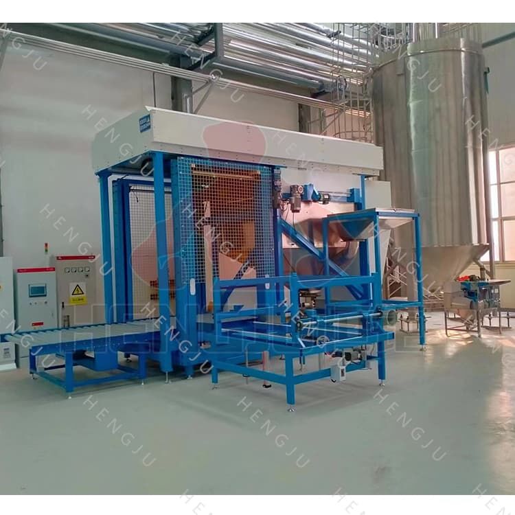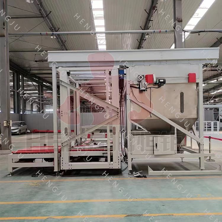 2. The forklift puts the pallet on the conveyor belt, and the conveyor belt convey the pallet to the bottom of the movable bag grabber which automatically grabs the bags and open them; the machine can automatically identify the lack of material at the station and replenish it.